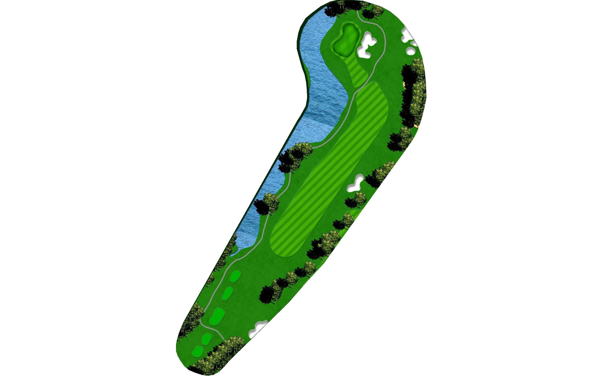 This downhill par 3 is protected by the lake on the right and a bunker in front of the back to front sloped green.