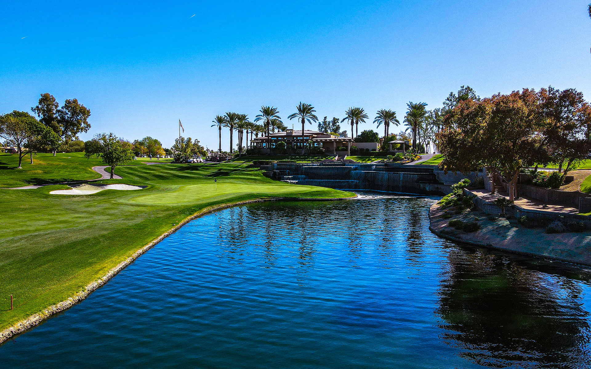 A great finishing hole, this dogleg left par 5 is the ultimate in risk vs. reward. The view of the waterfall and clubhouse as you approach the green leaves players with a great memory of the Lakes Course.