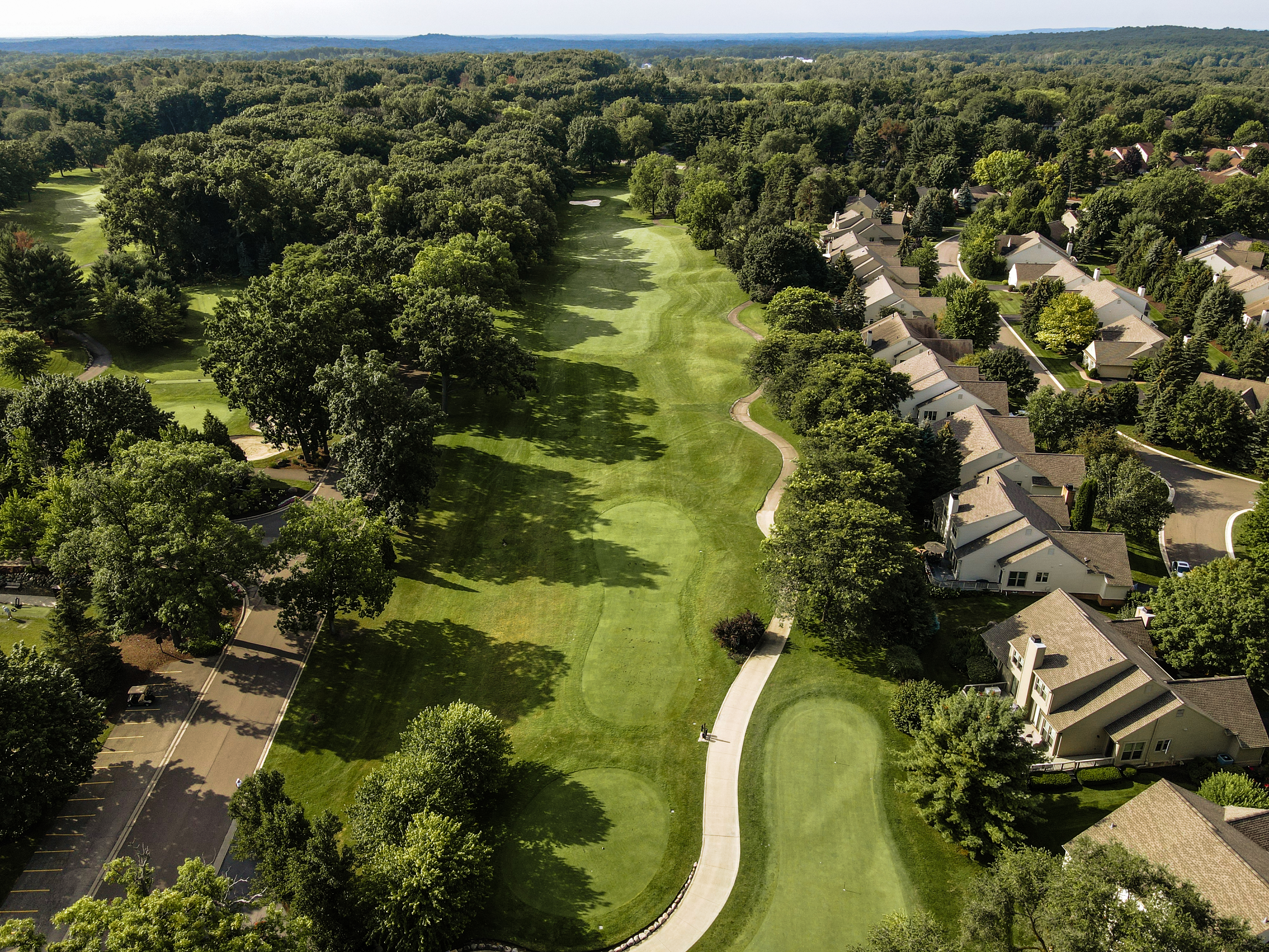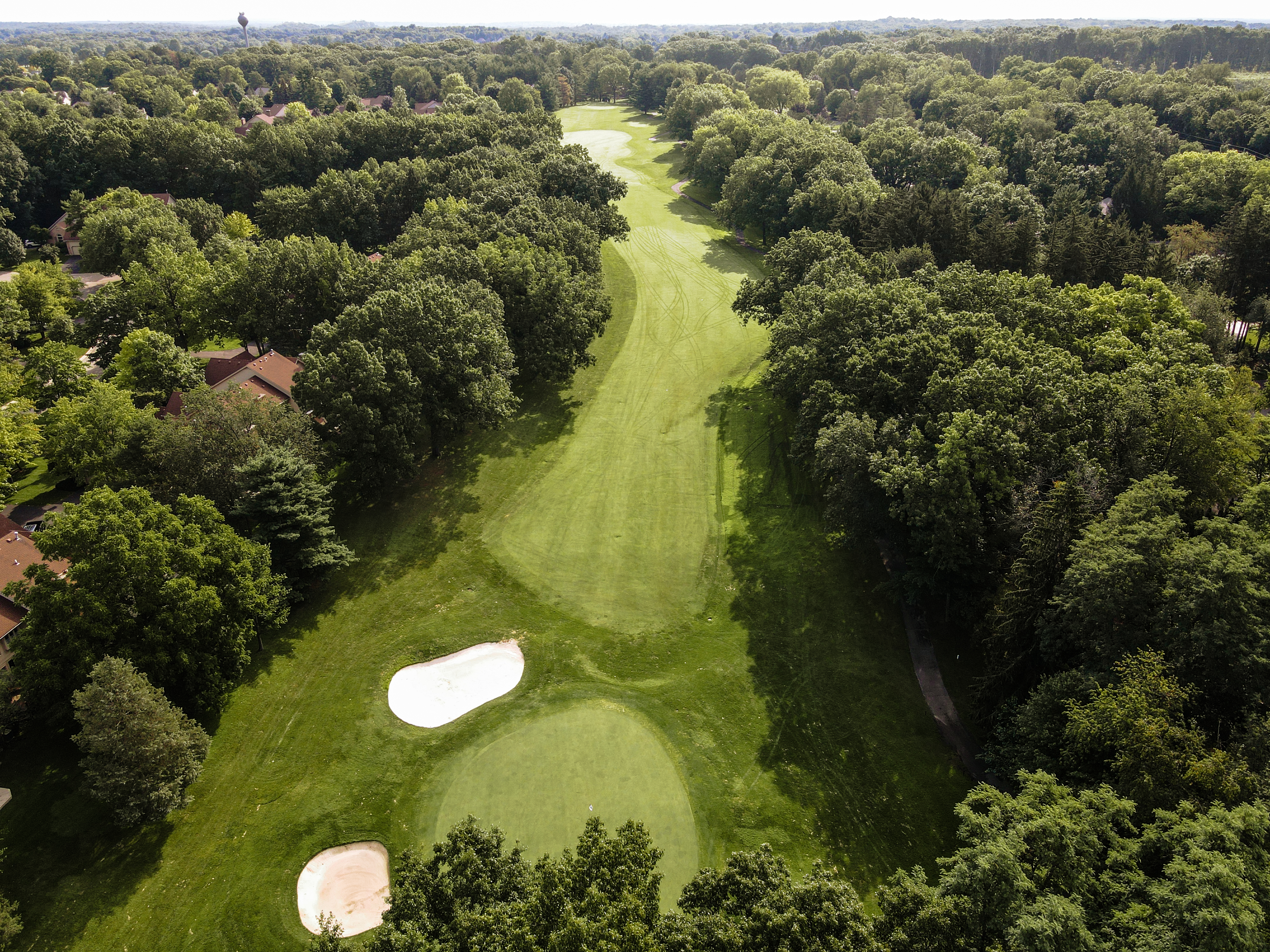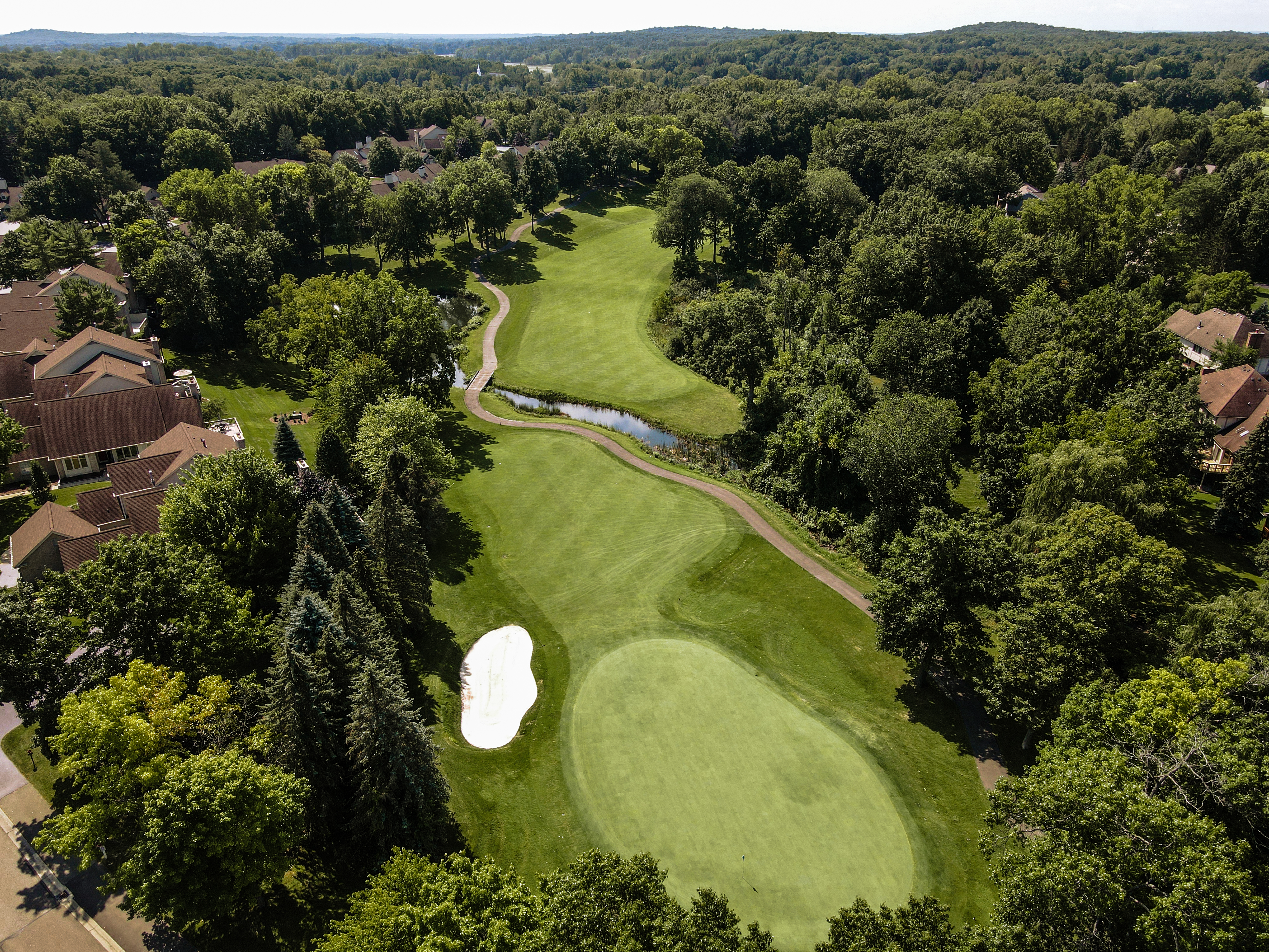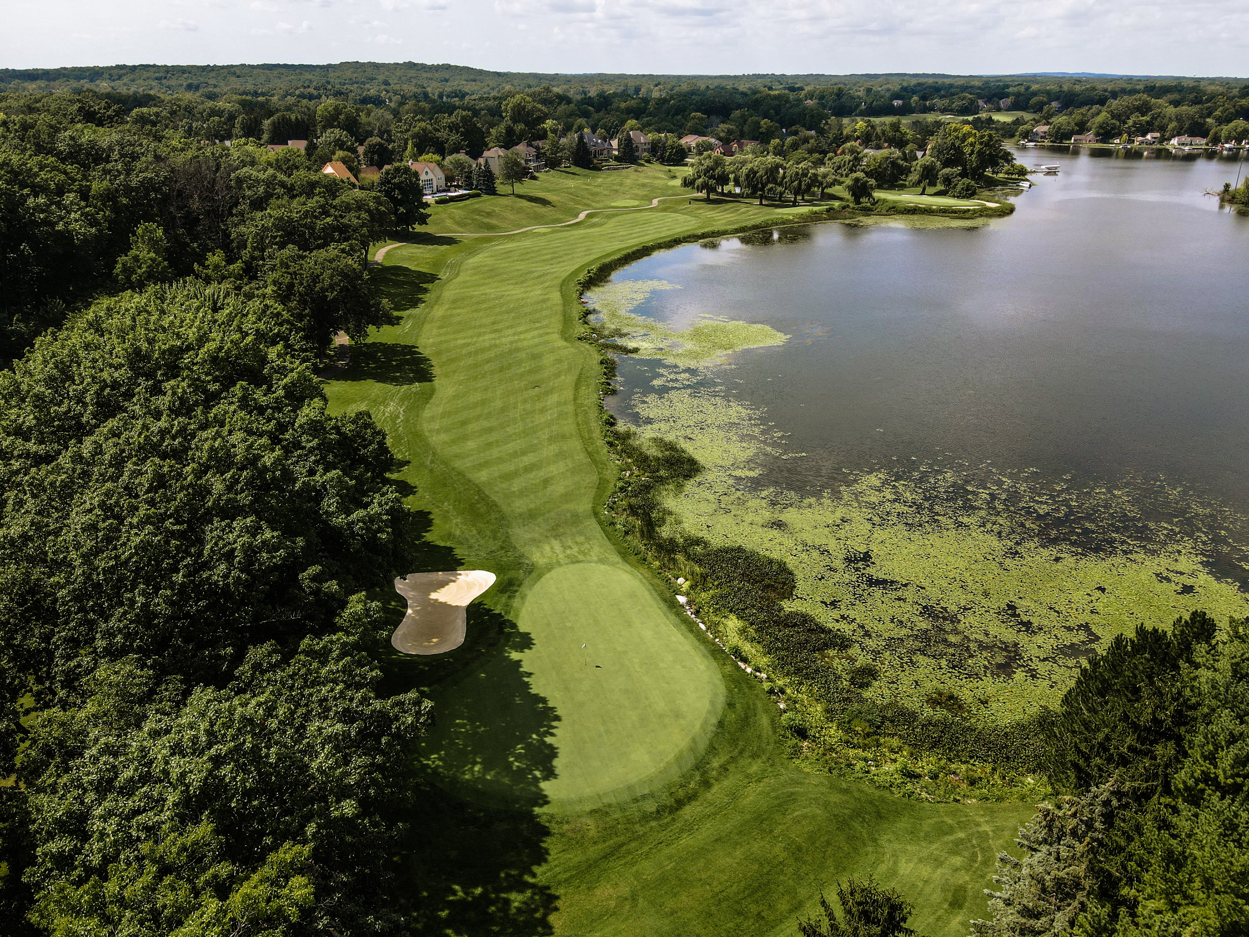 To paraphrase Arthur Hills the “Fun starts here”. Crooked lake guards the entire left side of this hole. The long par 4 requires a lot of attention on the approach. With the large bunker protecting the front right and a sloping green from right to left. It is key to hit the center of the green. This defining finishing hole has determined many outcomes of competitive play.