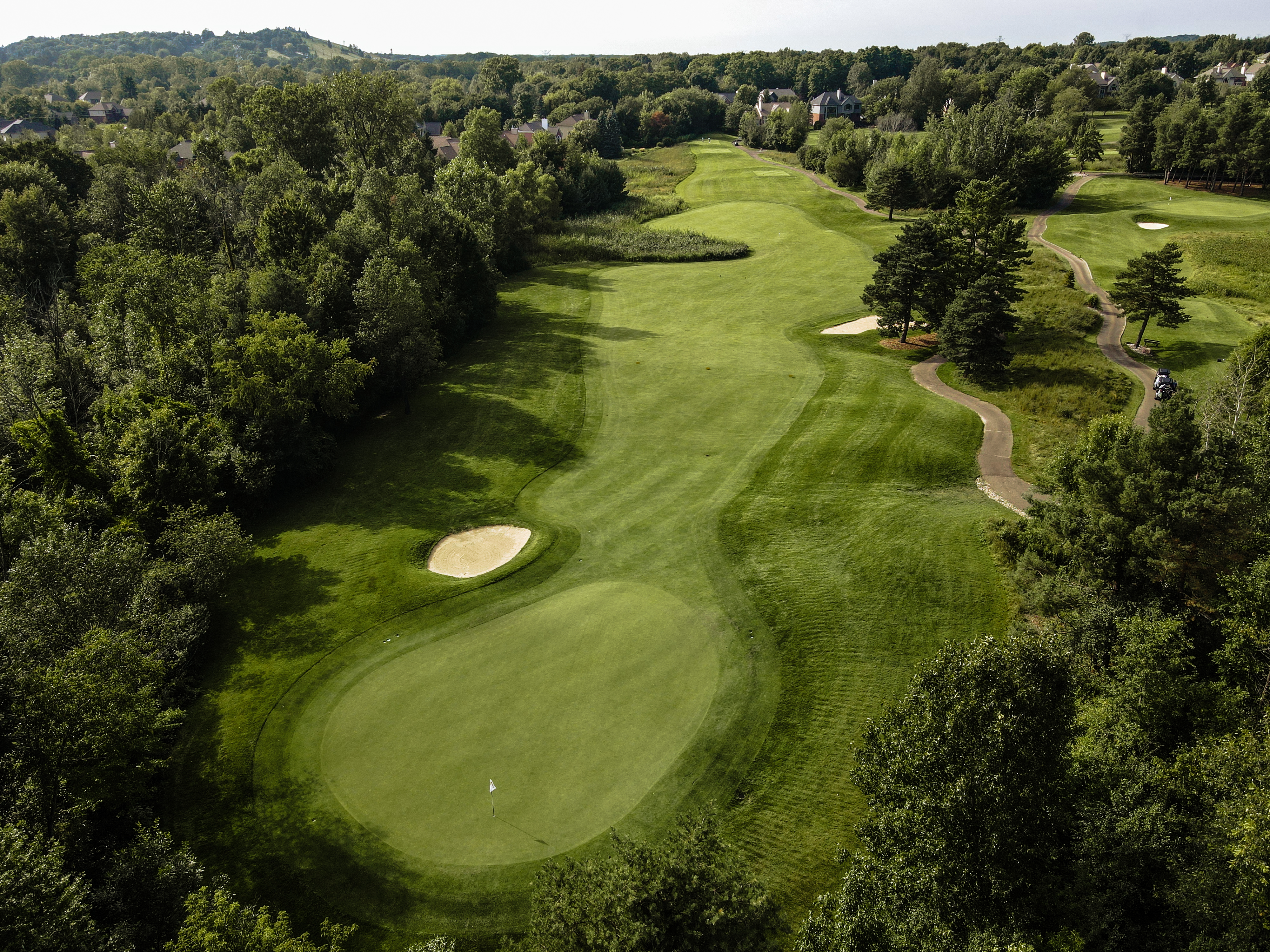 Avoid the fairway bunkers on the left. The fairway opens up to the right beyond last ridge up near the green. The green slopes from front towards the middle and there is a collection area off the back left corner.