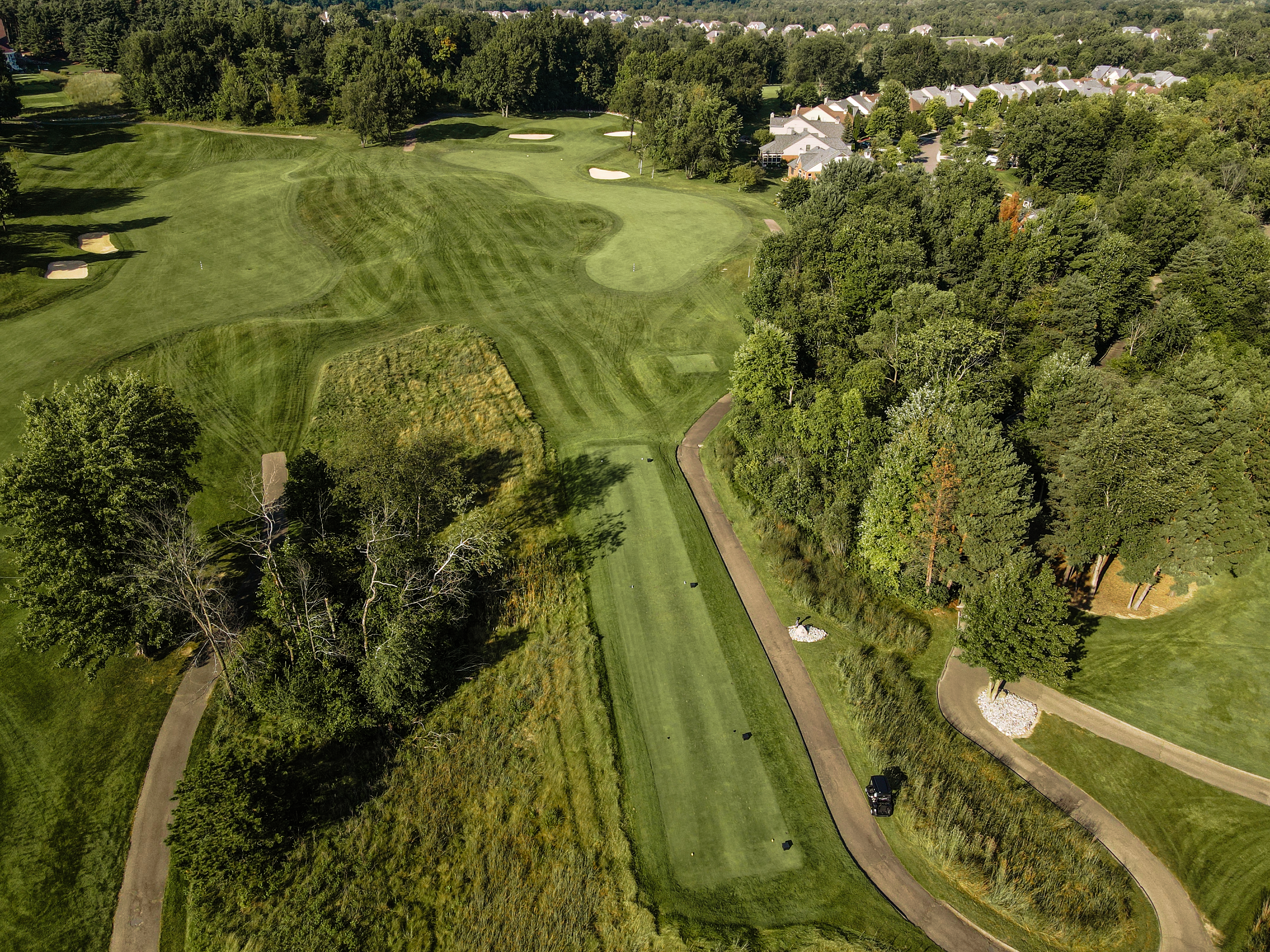 A long fade drive just over the right side of the large oak on the left will run down the hill. Too far right brings back yard unplayable out of bounds into threat. Without a crushing second shot the smart play is a lay-up just beyond the rock ridges for a short iron into a wide, shallow green. A significant landing beyond the marsh in front of the green is hidden from view. Long and over the green will probably be gone. The green slopes more left to right but also slopes back to front.