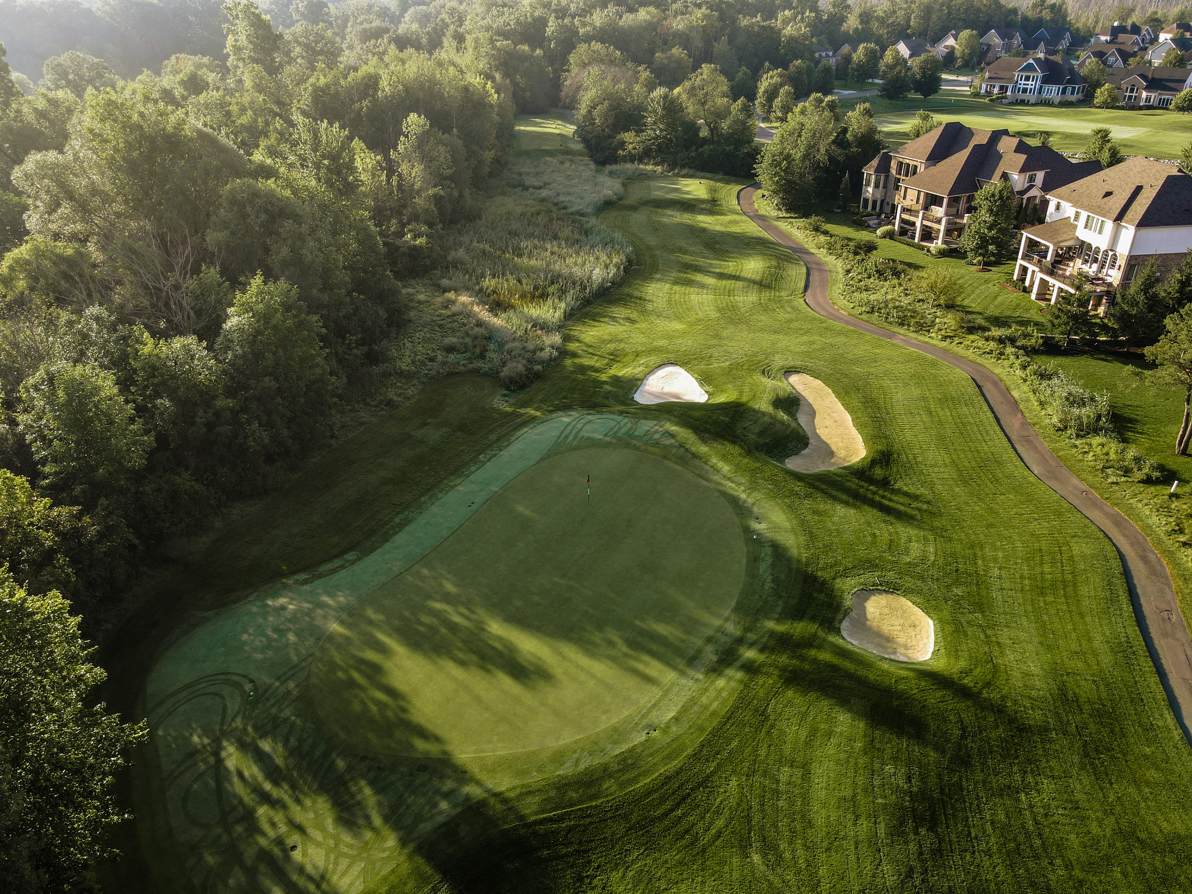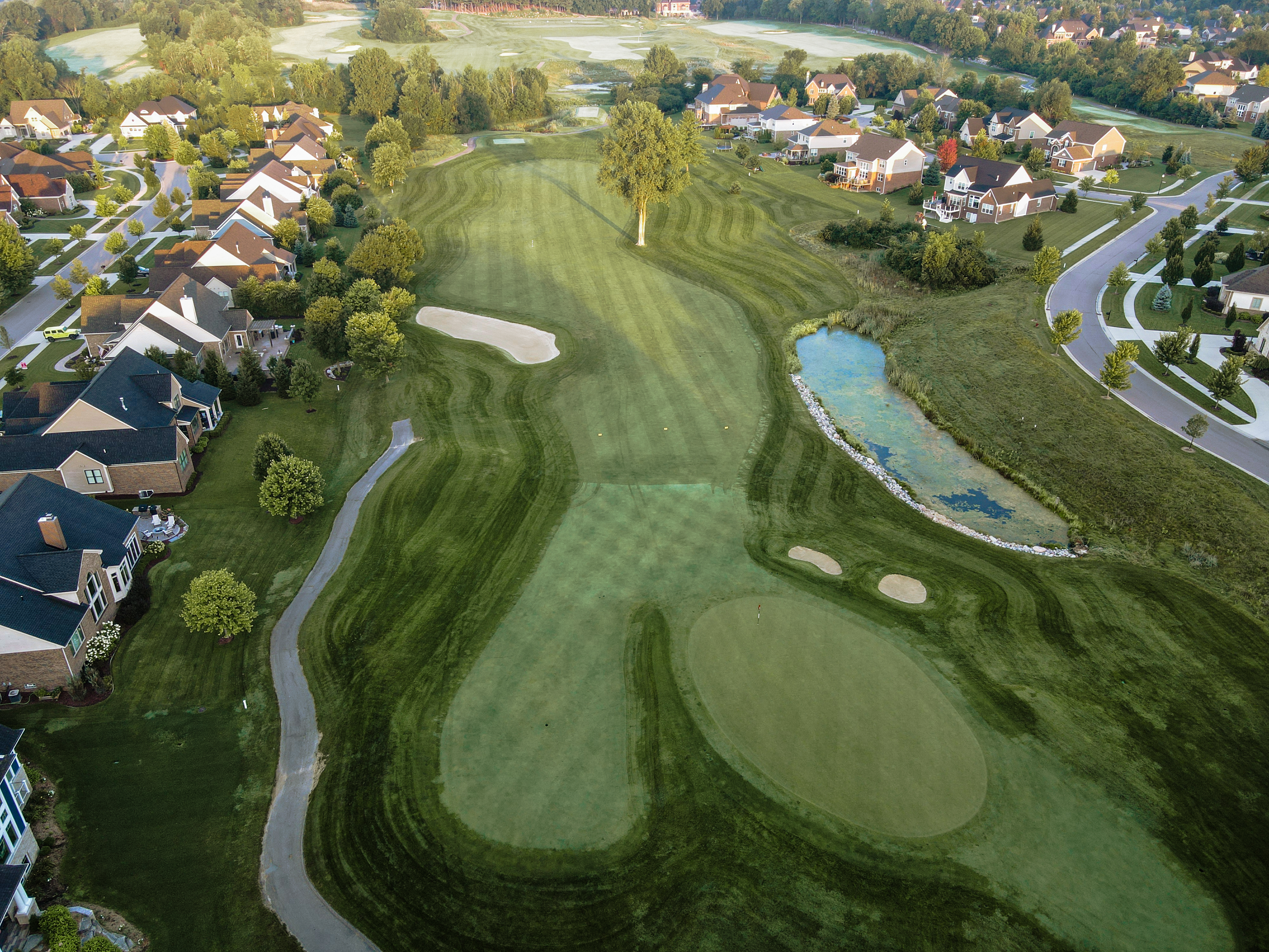 A shot down the left side brings the threat of unplayable backyard out of bounds. The long sand bunker down the right side is reachable from the tee. A straight drive to the 150-yard stake makes your second shot critical to a long left to right green protected by two sand bunkers on the left side. A massive collection area surrounds the back left and front right of this elevated green. The green really slopes back to front so a short shot to the pin will leave an uphill putt.