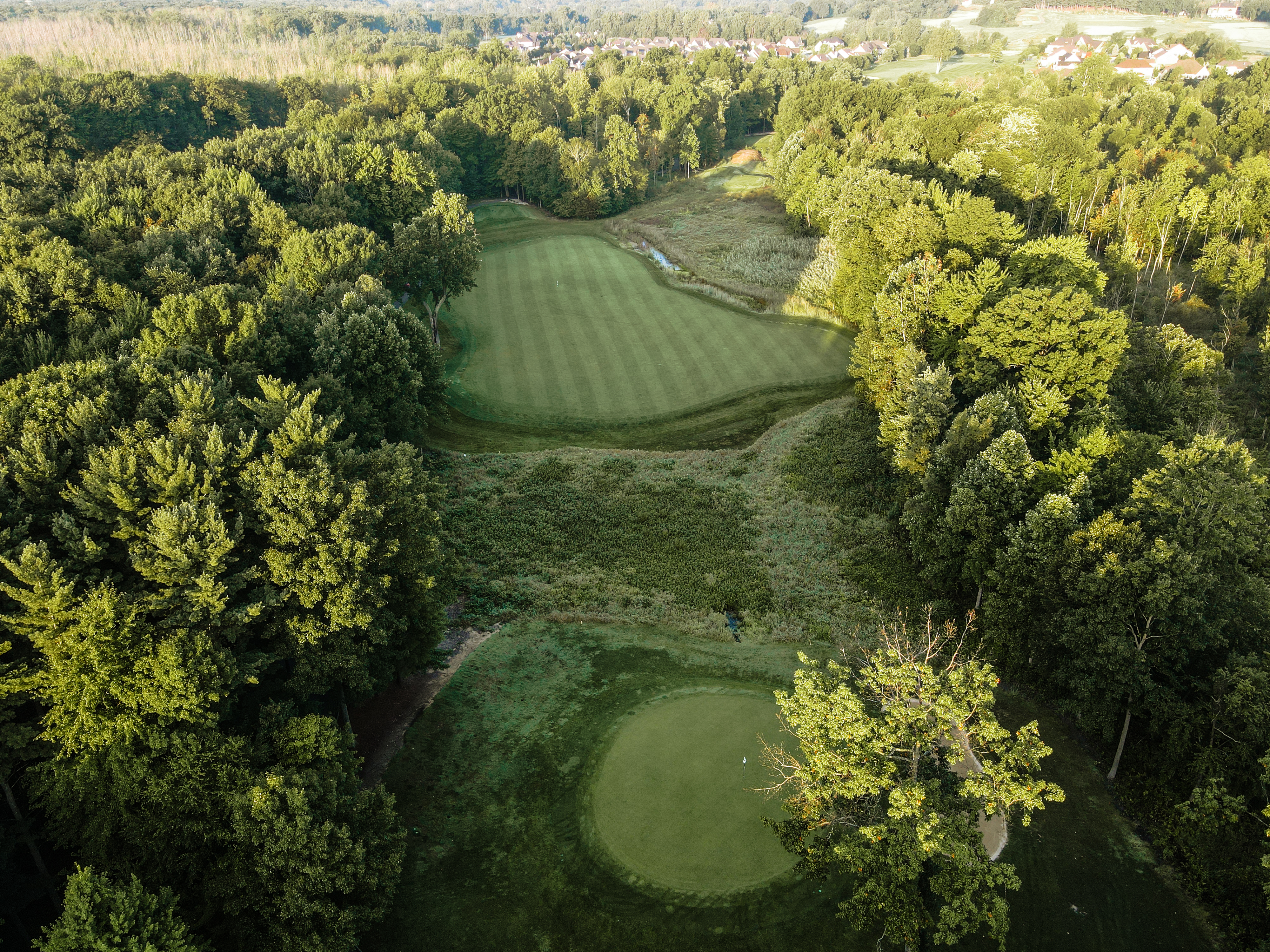 Pull out the driver and aim for the middle hump on the ridge towards left center. Longer shots will run down the back side and collect either in front of the green or stop just short of a small grass ridge. Long and left will be in the shallow grass hollow. If you are right of the fairway bunker the stand of trees will prevent a clean second shot at the green which slopes from the middle towards the front and rear. This is the hardest green to read on the course.