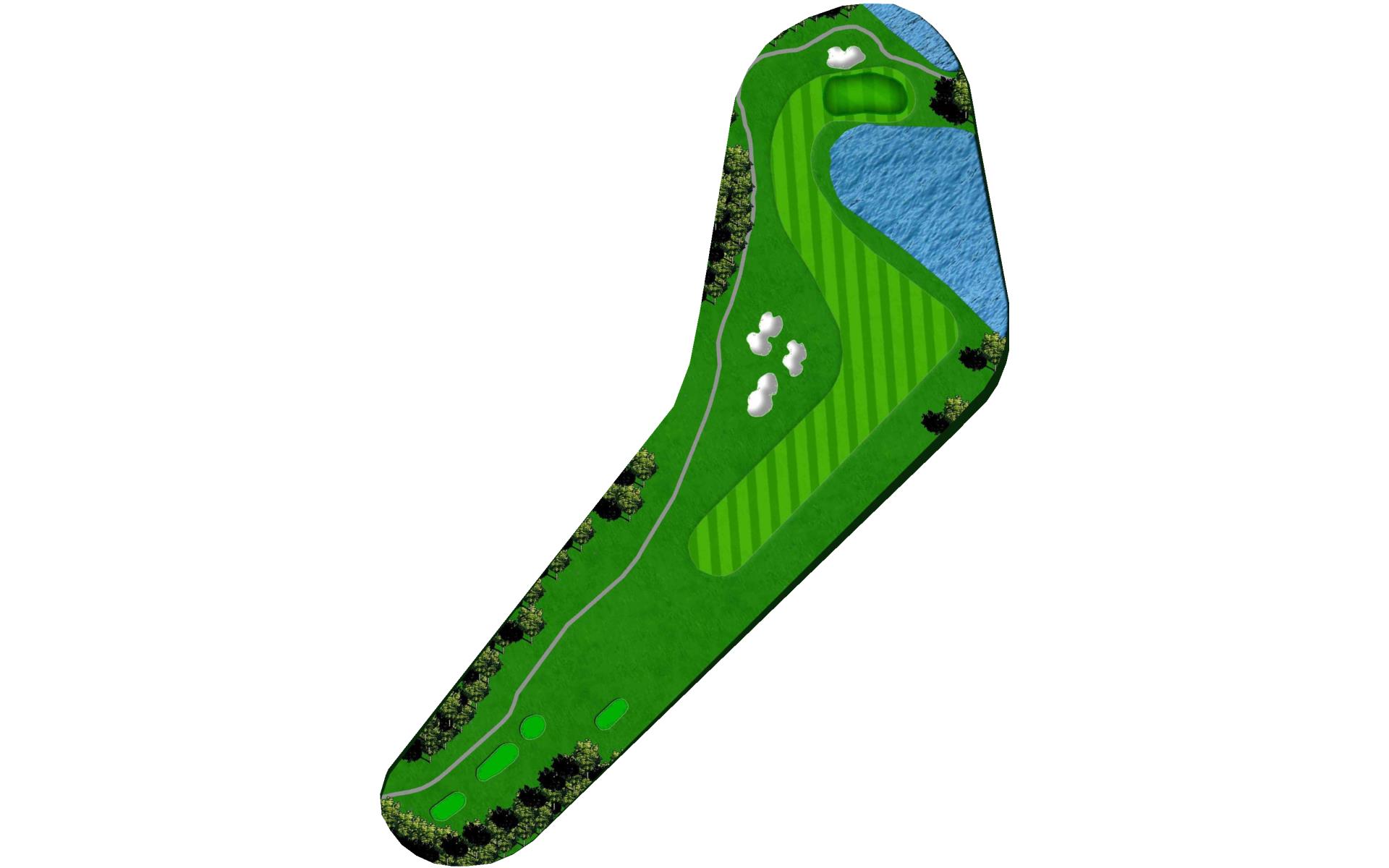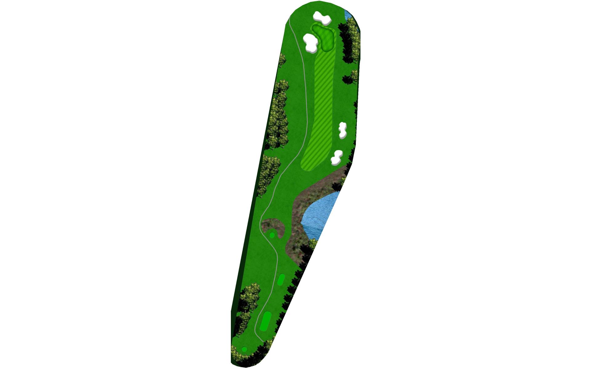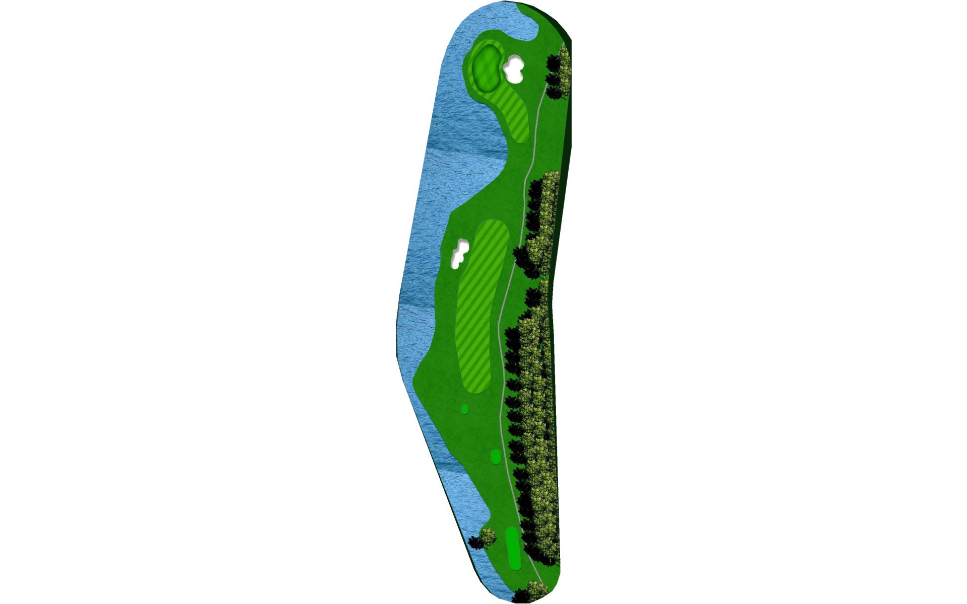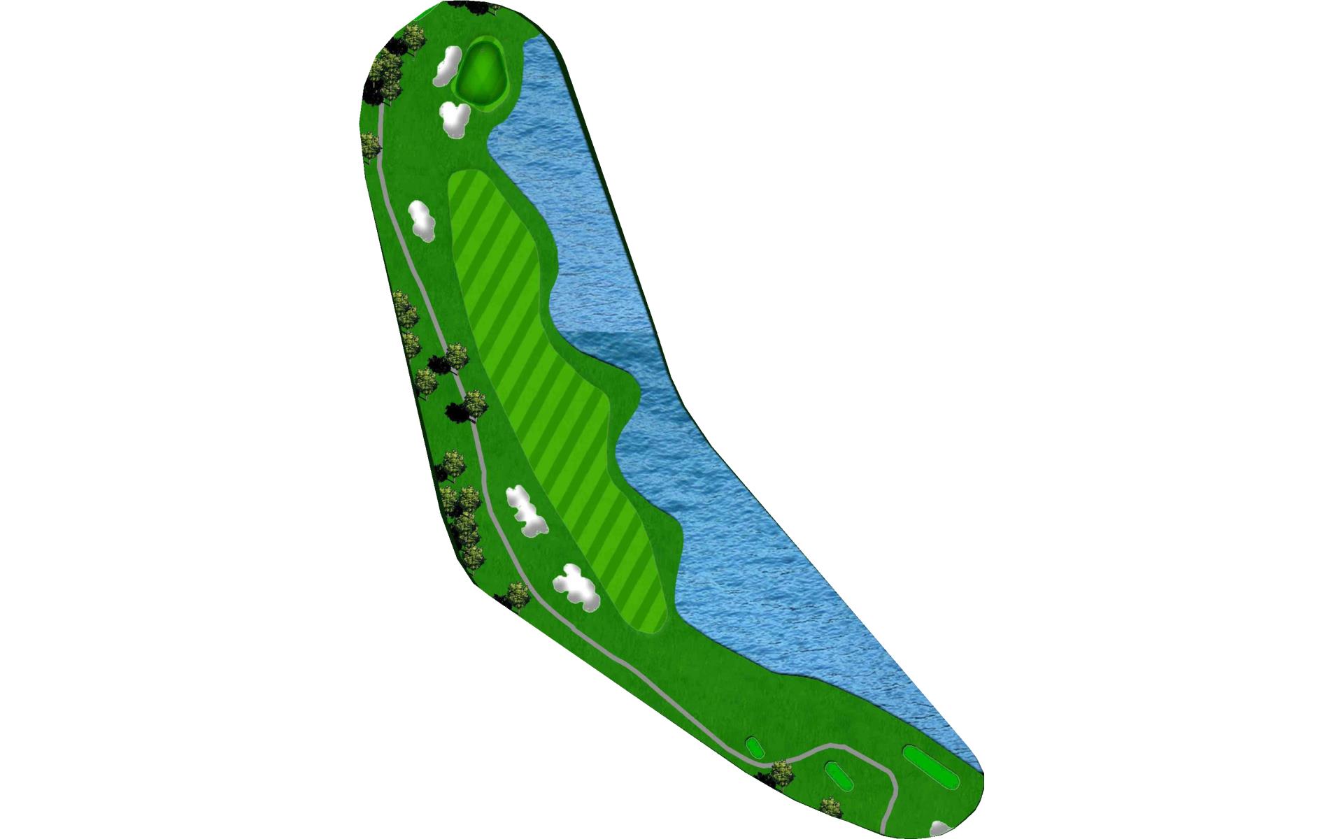 Dogleg left with a beautiful backdrop view of the lake. The left side slopes hard towards the fairway, while the right side is protected by …